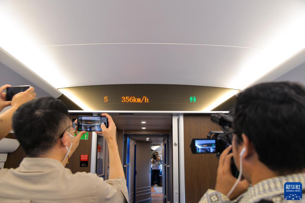 6月22日,在印度尼西亞雅萬(wàn)高鐵正在進(jìn)行聯(lián)調聯(lián)試的綜合檢測列車(chē)上,記者們拍攝顯示列車(chē)時(shí)速超過(guò)350公里的電子屏。