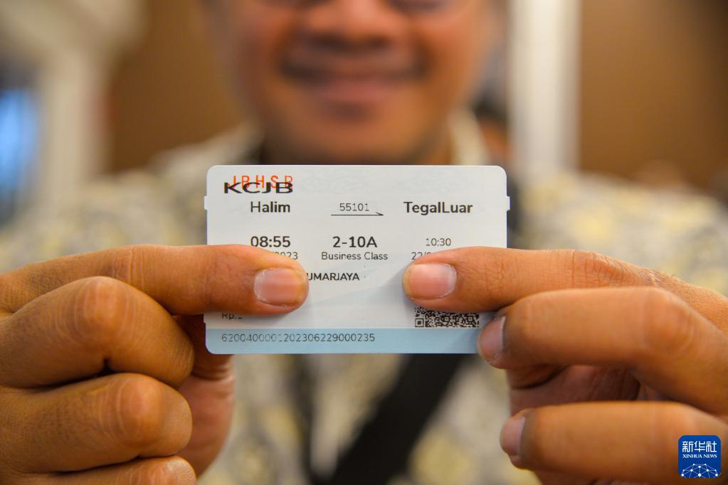 6月22日,在印度尼西亞雅萬(wàn)高鐵正在進(jìn)行聯(lián)調聯(lián)試的綜合檢測列車(chē)上,一名記者展示紀念樣票。