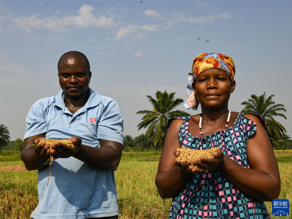 6月20日,在布隆迪布班扎省基航加縣,農民在田間手捧雜交水稻谷粒。