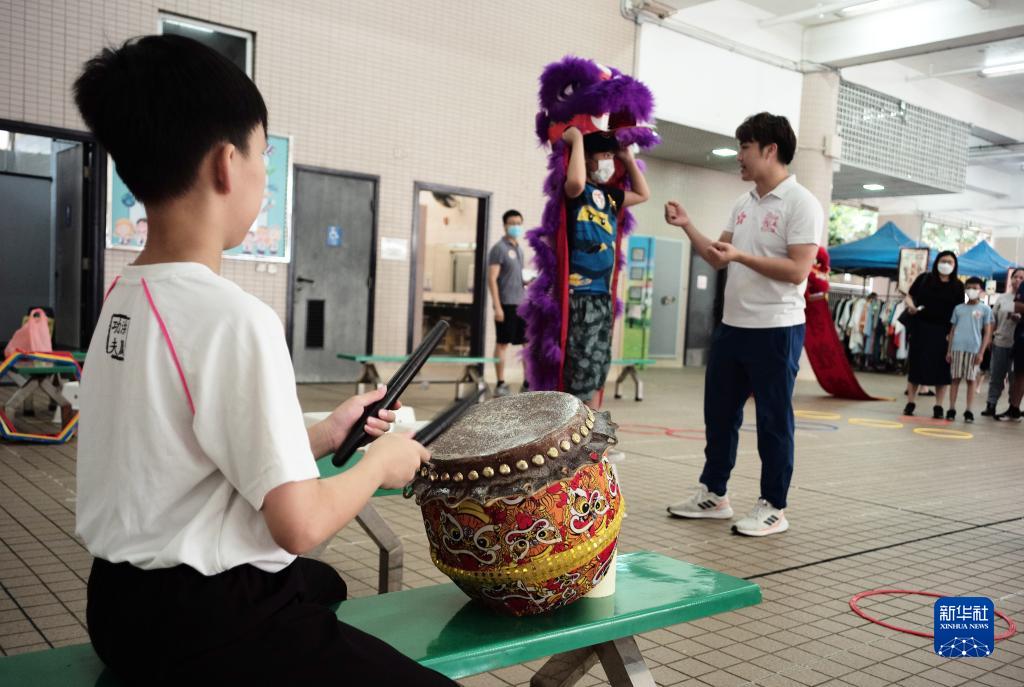 在香港漢華中學(xué),小朋友體驗舞獅表演(6月18日攝)。