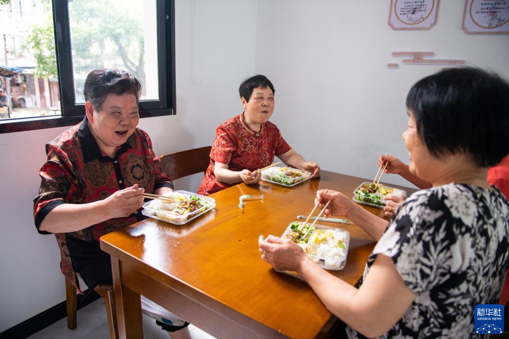 6月20日,老人們在漢壽縣龍陽(yáng)街道城東社區日間照料中心吃午餐。