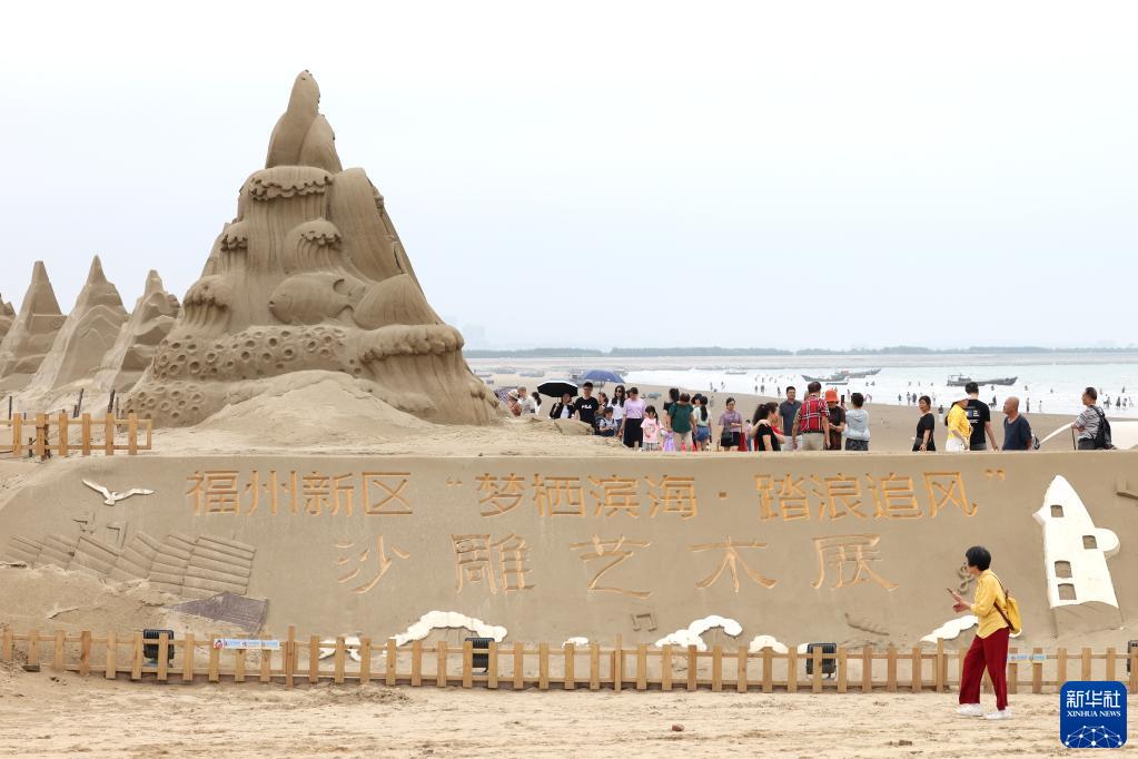 6月23日,游客在福州市長(cháng)樂(lè )區江田鎮下沙海濱度假村觀(guān)看沙雕藝術(shù)展。