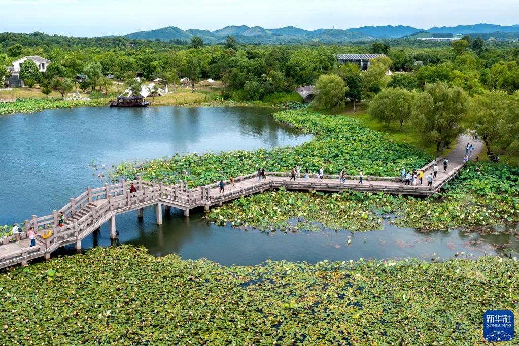 6月23日,游客在浙江省湖州市長(cháng)興縣仙山湖景區賞荷觀(guān)景(無(wú)人機照片)。