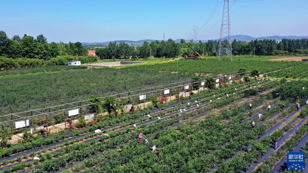 6月23日,在乳山伯瑞合作聯(lián)社夏村鎮藍莓基地,果農在采摘藍莓(無(wú)人機照片)。該聯(lián)合社帶動(dòng)600多位村民就業(yè)增收。