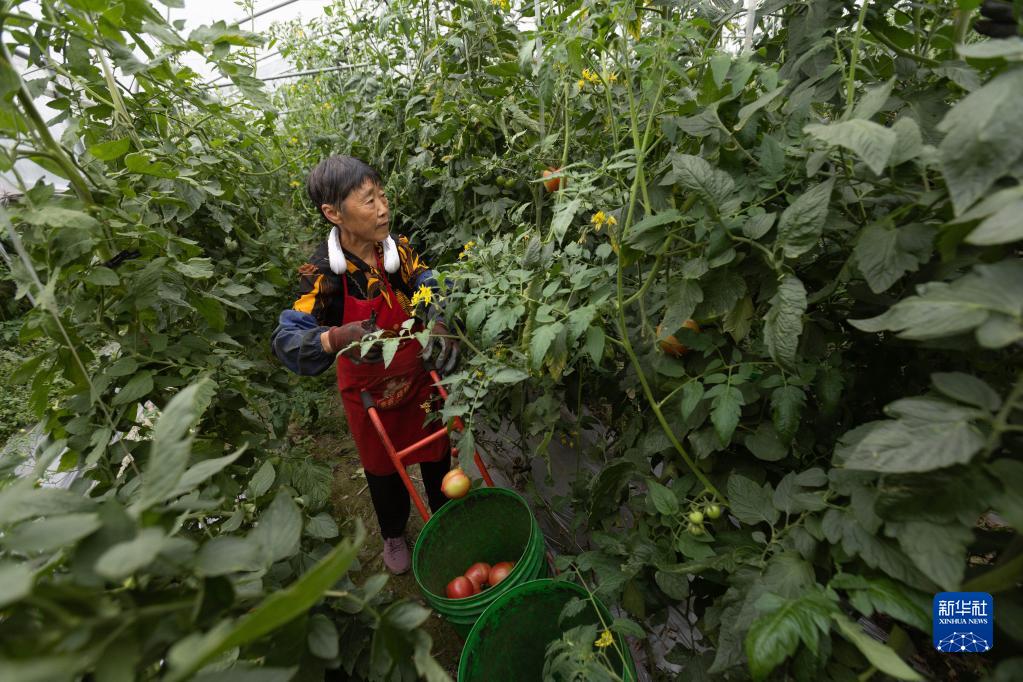 在東風(fēng)堰灌溉區域之一的夾江縣甘江鎮金銀河村,村民在采摘西紅柿(6月23日攝)。