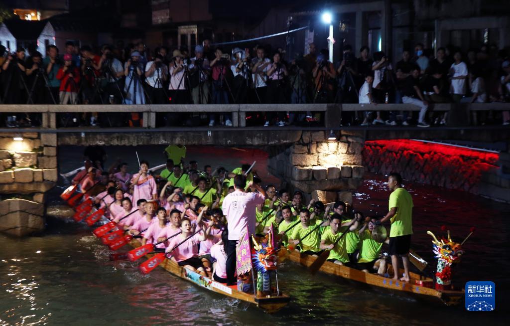 人們在福州市長(cháng)樂(lè )區三溪村一條穿村而過(guò)的小溪中夜劃龍舟(2023年6月18日攝)。