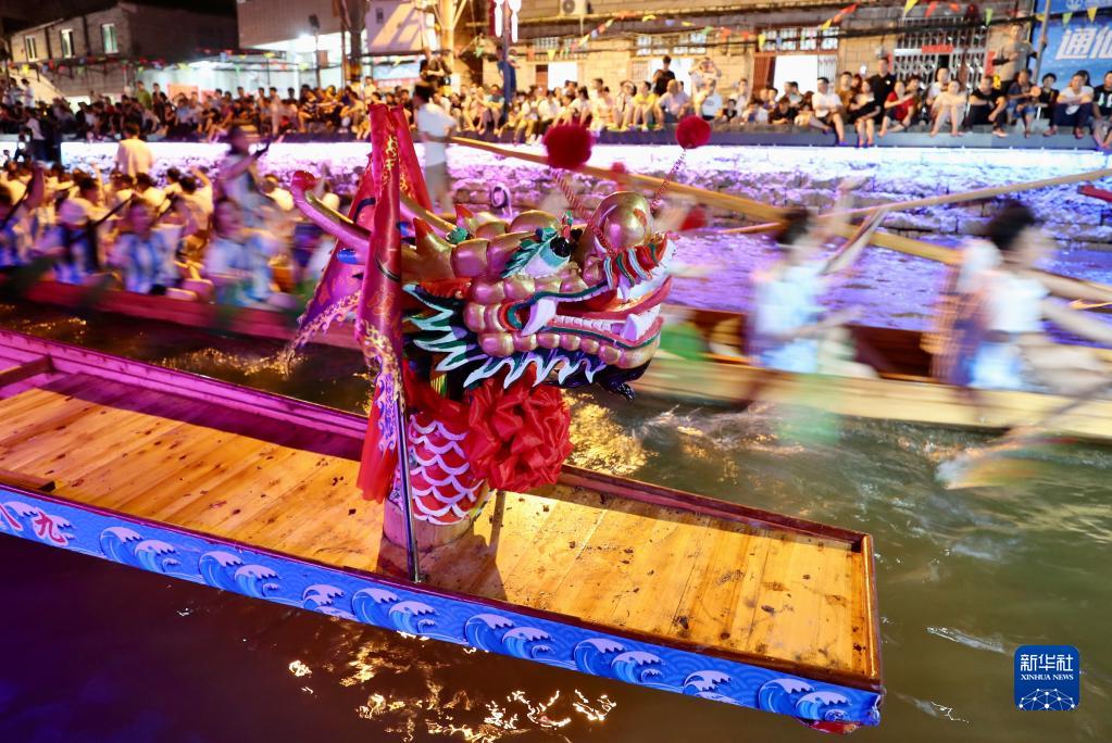 人們在福州市長(cháng)樂(lè )區三溪村穿村而過(guò)的小溪中劃龍舟(2023年6月20日攝)。