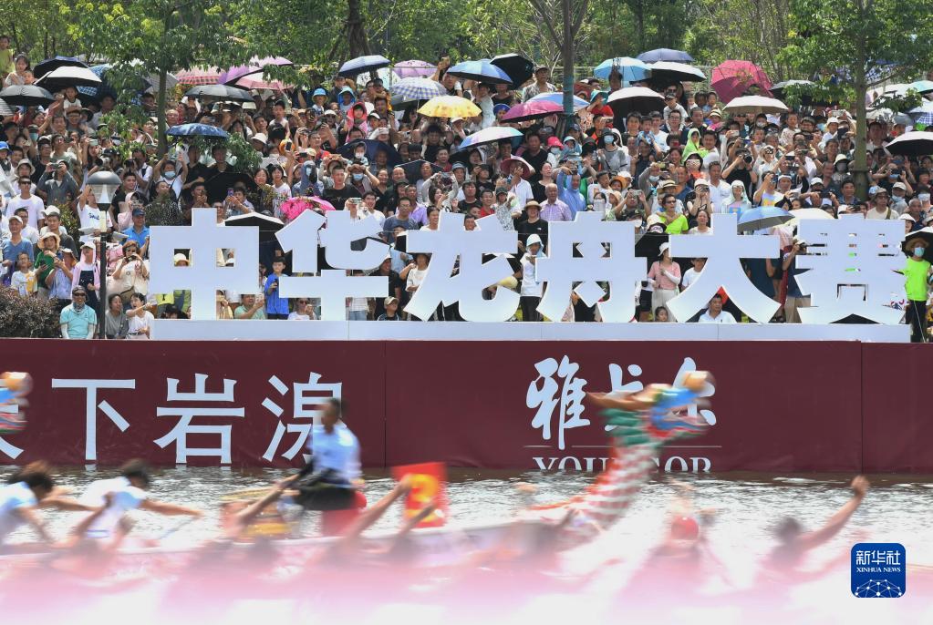 市民在福州海峽國際會(huì )展中心浦下河段龍舟池畔觀(guān)看中華龍舟大賽(福建·福州站)比賽(2023年6月22日攝)。