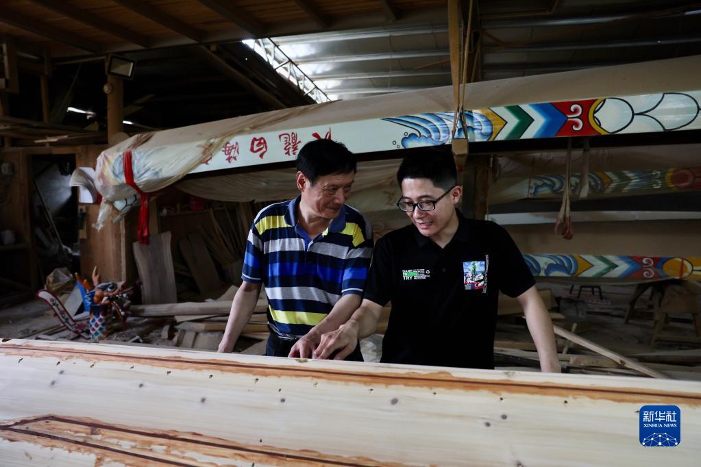 方紹晃(左)在福州市閩侯縣方莊村向侄子方劍偉講解龍舟船體構造(2022年5月30日攝)。