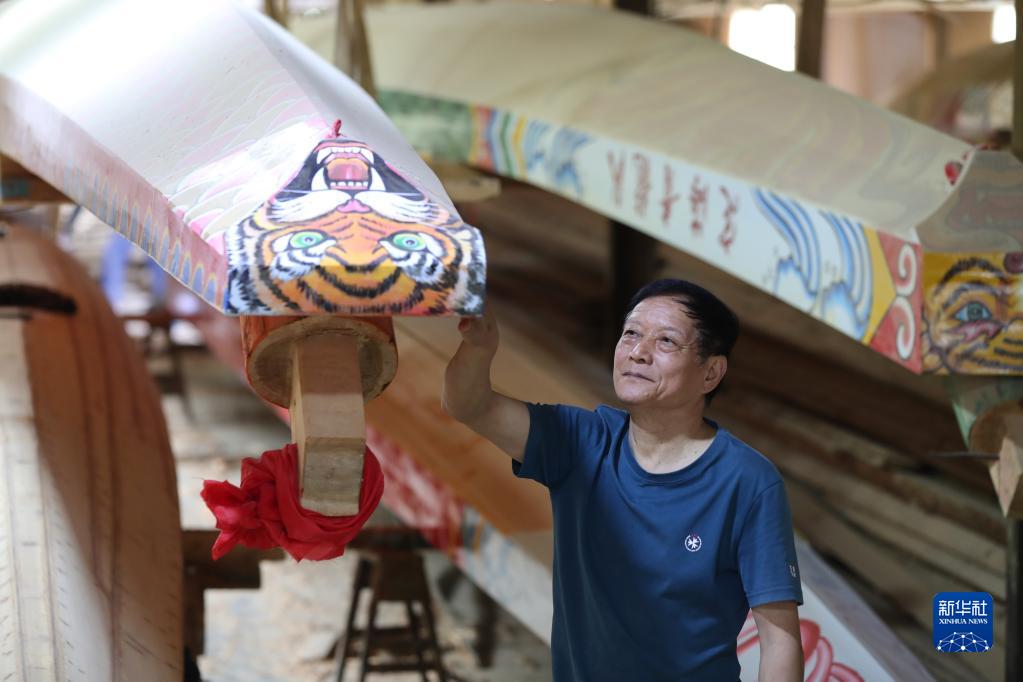 方紹晃查看贈送馬祖鄉親的新龍舟(2023年5月23日攝)。