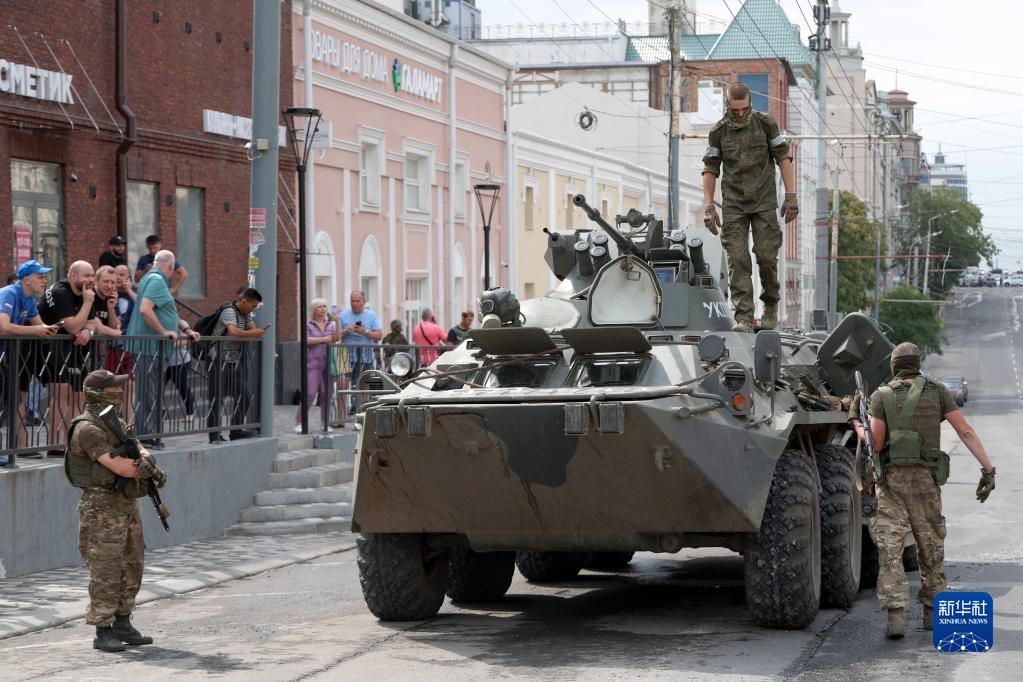 這是6月24日在俄羅斯頓河畔羅斯托夫拍攝的瓦格納組織武裝人員及裝甲車(chē)輛。