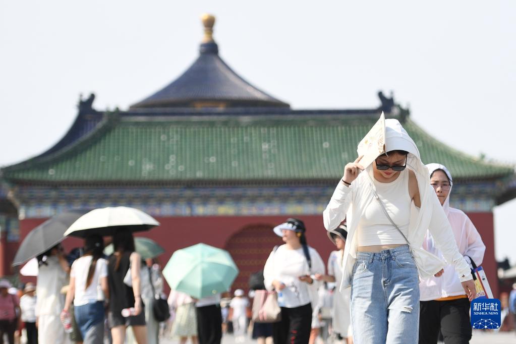 6月23日,在北京天壇公園,一位游客用手提紙袋抵擋強烈的陽(yáng)光。