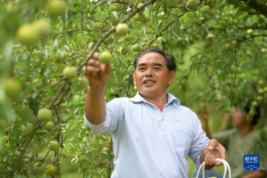6月24日,夏國剛在貴州省開(kāi)陽(yáng)縣龍水鄉龍溪村烏江河畔的果園采摘蜂糖李。
