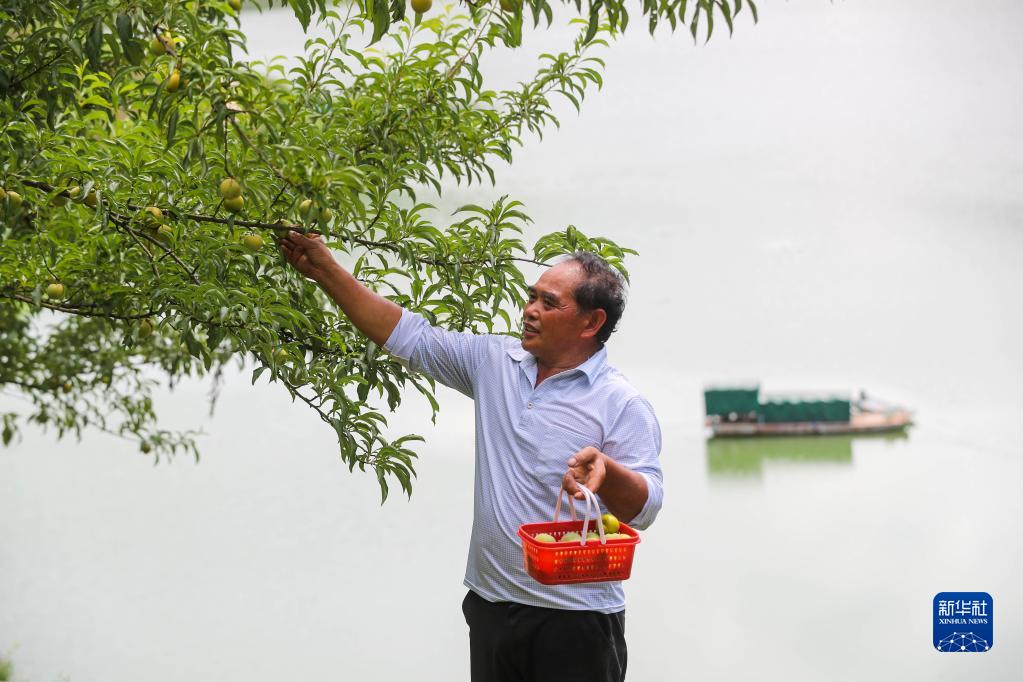 6月24日,夏國剛在貴州省開(kāi)陽(yáng)縣龍水鄉龍溪村烏江河畔的果園里采摘蜂糖李。
