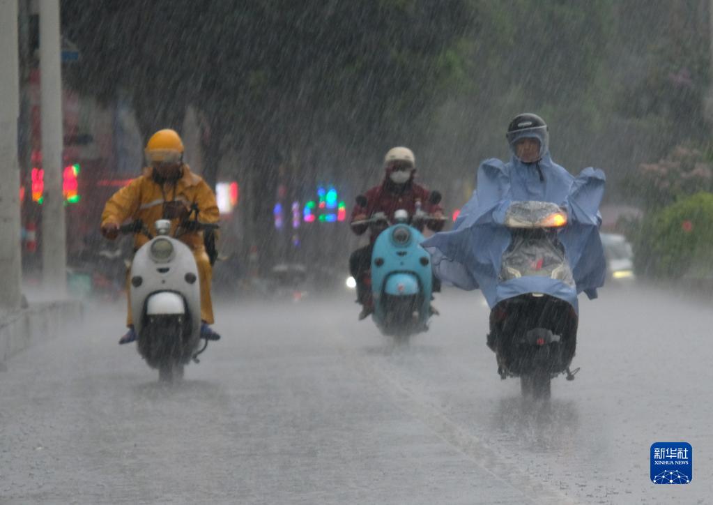 6月24日,市民冒雨騎行在廣西南寧市街頭。