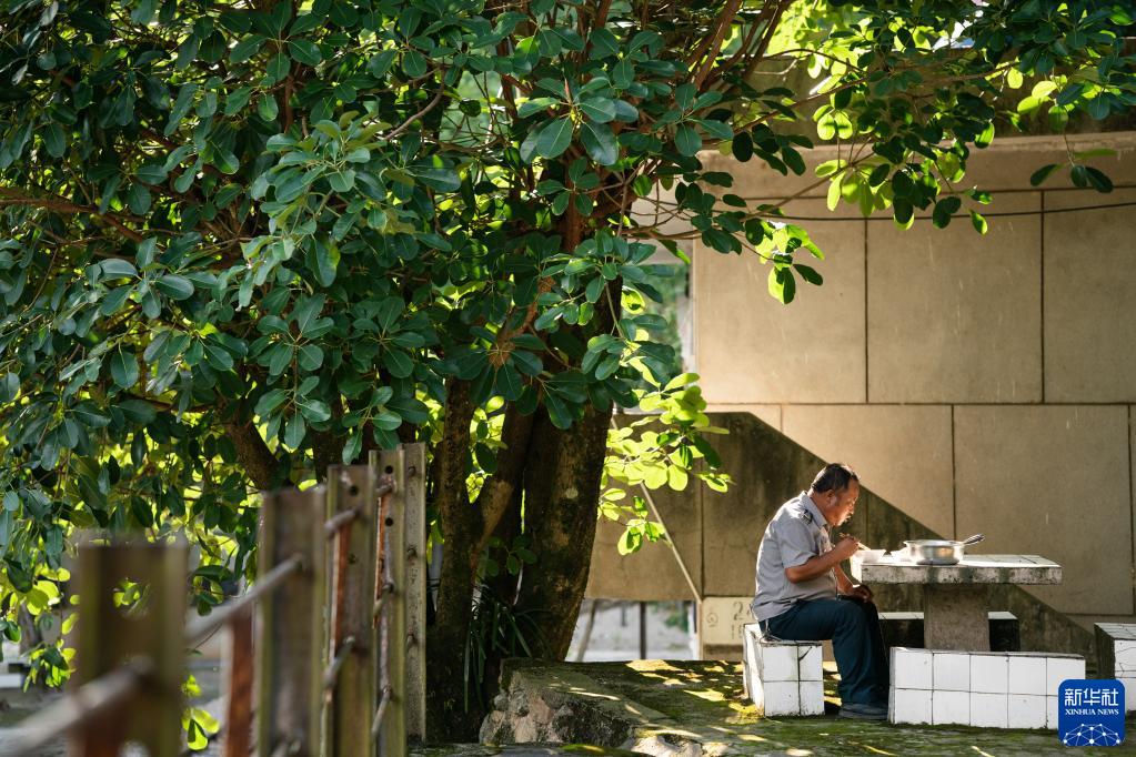 6月20日,楊有光在宿舍樓旁的石桌上吃晚飯。