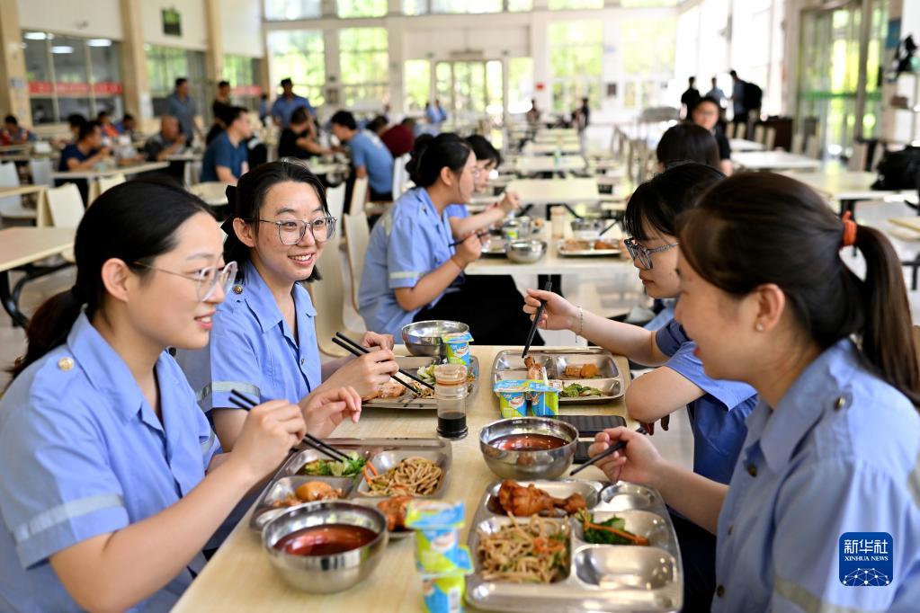 天車(chē)司機王孟媛(左二)和同事們在食堂吃午飯(6月20日攝)。