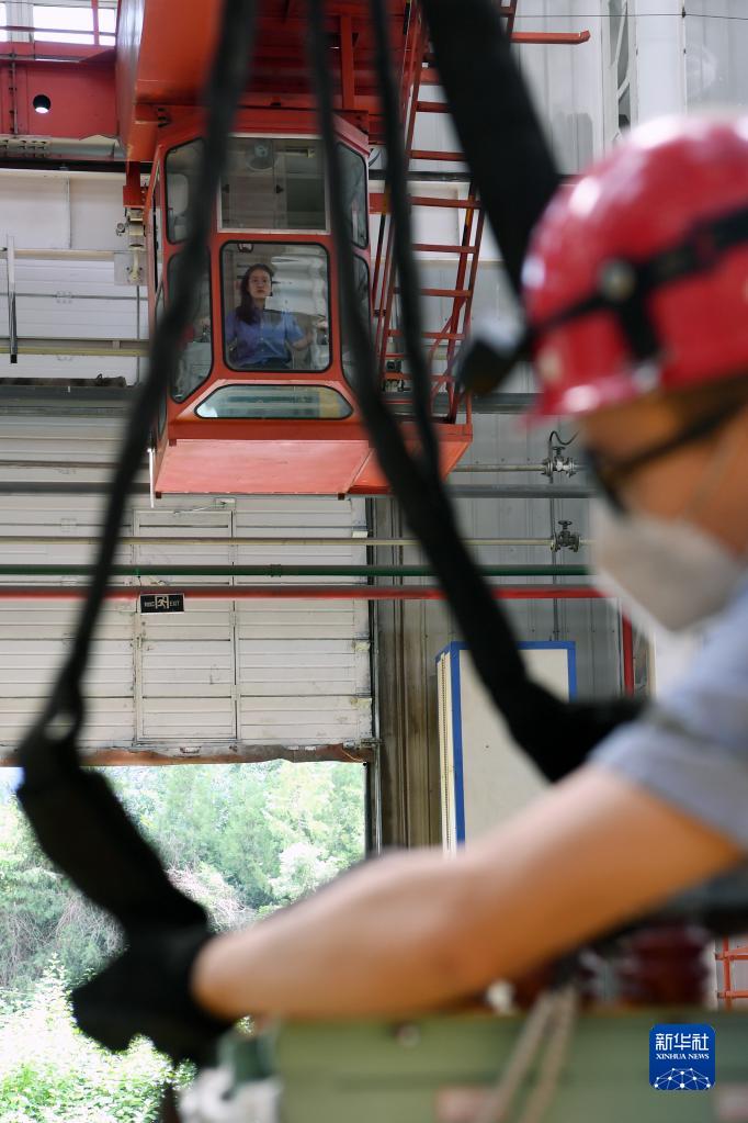 在中國鐵路太原局集團有限公司太原機務(wù)段太北檢修車(chē)間,天車(chē)司機賀鑫在天車(chē)上作業(yè)(6月15日攝)。