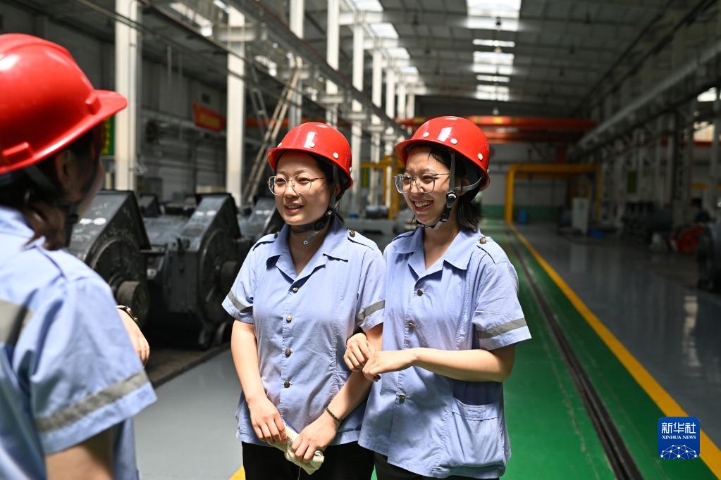上午工作結束后,動(dòng)力組天車(chē)司機王孟媛(右)和同事們聊天(6月20日攝)。