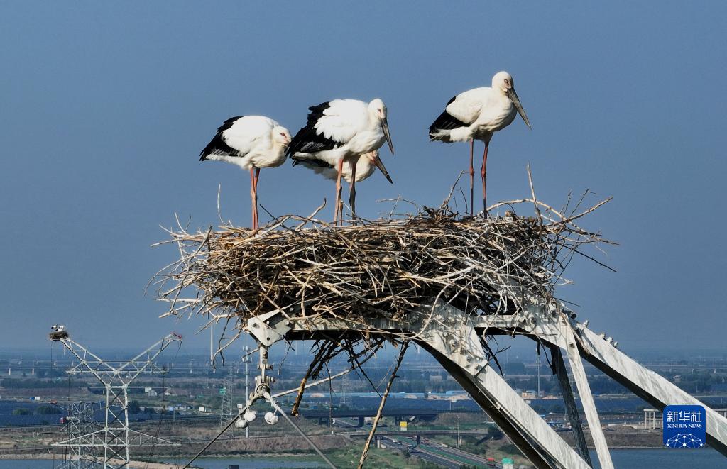 近日,在河北省唐山市豐南區黑沿子鎮沿海濕地附近的高壓電線(xiàn)鐵塔上的巢穴中,新孵化出的近30只東方白鸛幼鳥(niǎo)羽翼漸豐,它們在成年?yáng)|方白鸛的看護下茁壯成長(cháng)。據介紹,隨著(zhù)當地政府不斷加大環(huán)境治理和生態(tài)功能修復力度,東方白鸛的棲息地從最初的黑沿子鎮逐步向周邊擴大,轄區內沿海濕地也成為國家一級保護動(dòng)物東方白鸛的重要棲息地。