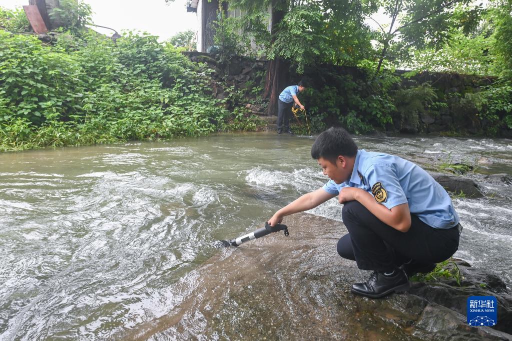 6月25日,杭州市生態(tài)環(huán)境局臨安分局的工作人員在位于臨安區的杭州亞運會(huì )場(chǎng)館周邊的溪水里取樣。