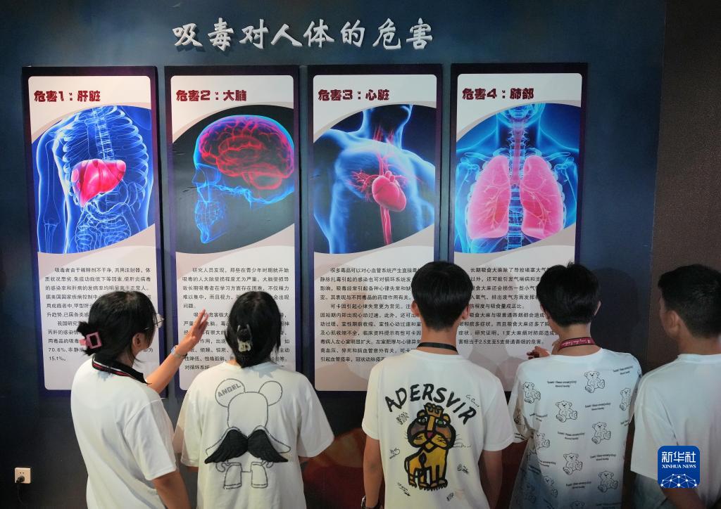 6月25日,高中生在山東省煙臺市牟平區禁毒教育基地了解吸毒對人體的危害。