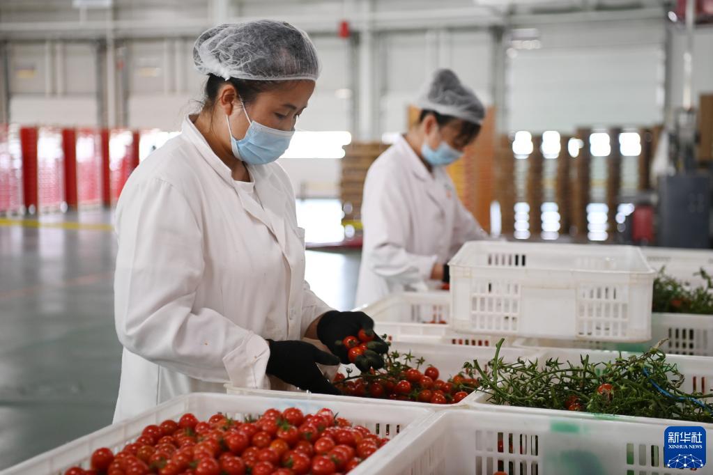 在張掖市民樂(lè )工業(yè)園內的一家農業(yè)公司,工作人員在分揀串收番茄(6月25日攝)。