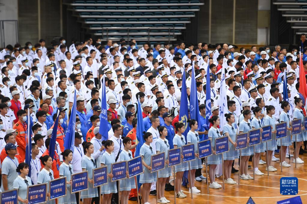 6月26日,參賽隊伍在浙江舟山體育館參加第六屆中國海員技能大比武開(kāi)幕式。