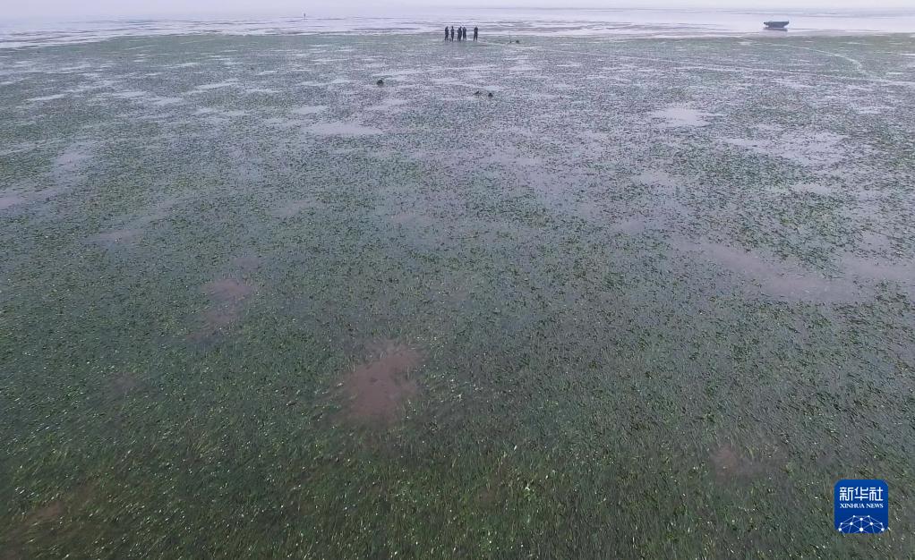 唐山祥云灣海洋牧場(chǎng)的技術(shù)人員在察看鰻草海草床的情況(2021年8月11日攝)。