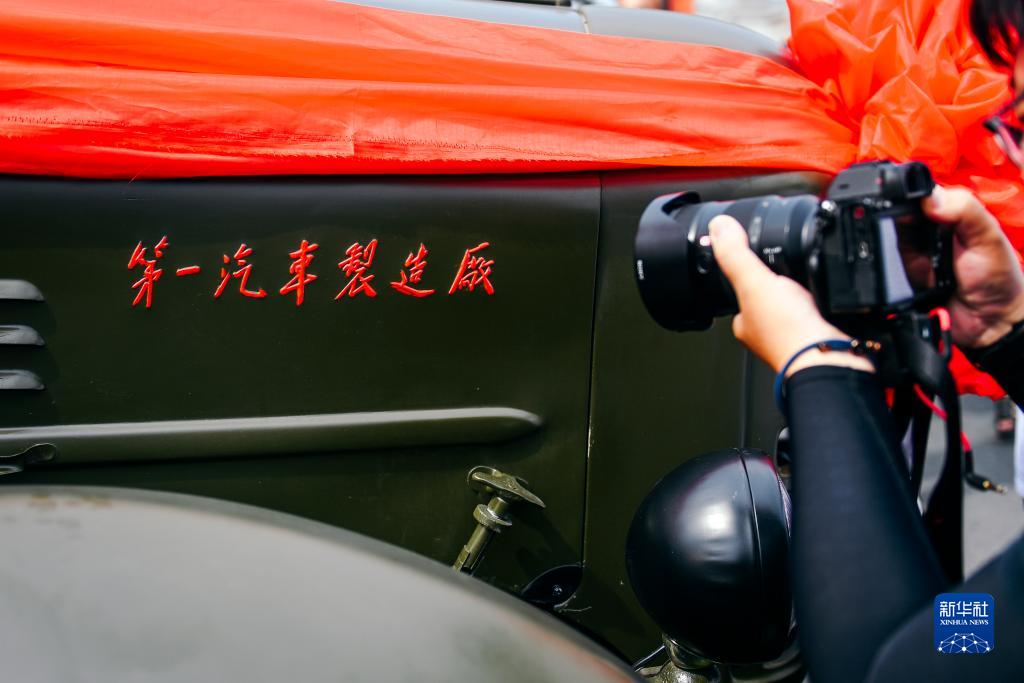 6月26日,一名媒體記者在活動(dòng)現場(chǎng)拍攝一汽解放第一代產(chǎn)品CA10型號卡車(chē)車(chē)身上的“第一汽車(chē)制造廠(chǎng)”字樣標識。