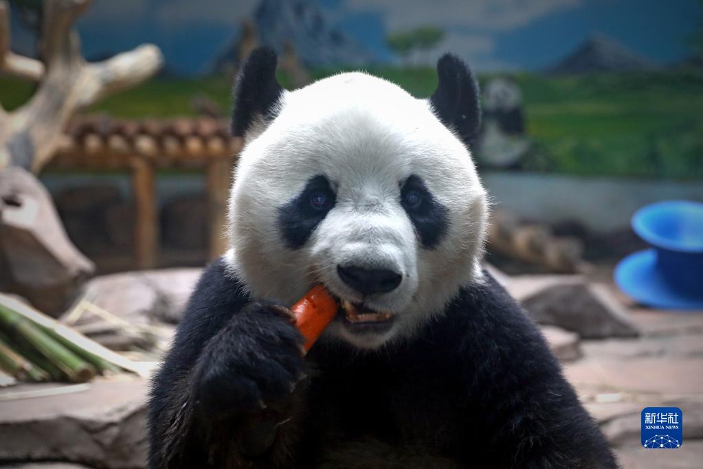 6月26日,“剛剛”在鞍山動(dòng)物園熊貓館里吃胡蘿卜。