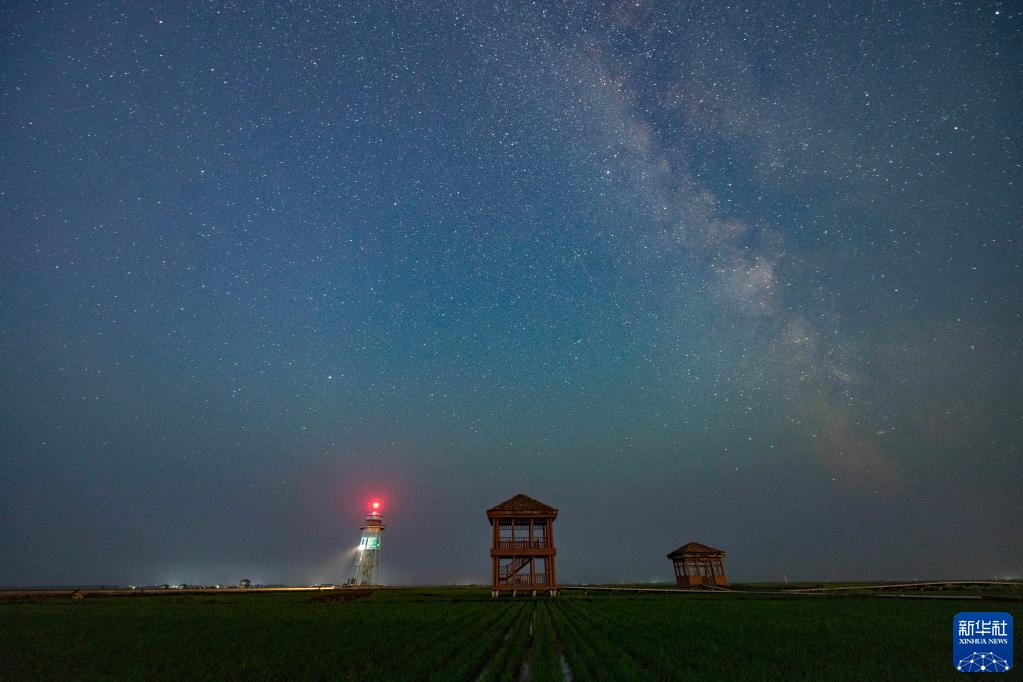 夏日夜晚,黑龍江省富錦市萬(wàn)畝水稻公園的稻田之上星空璀璨,美麗壯觀(guān)。