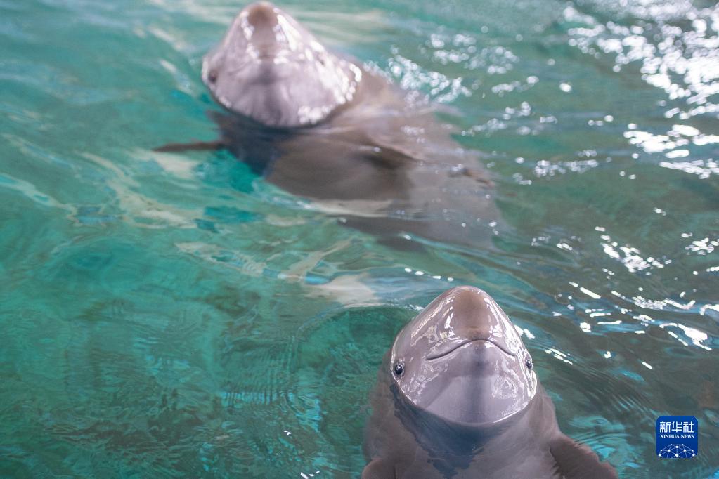 6月27日,江豚媽媽“福久”和小江豚“F9C22”(前)在水中游動(dòng)。