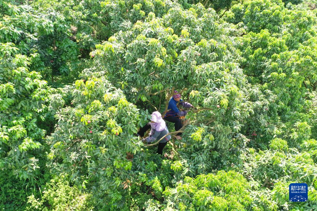 6月27日,廣西北流市北流鎮六行村村民在采摘荔枝(無(wú)人機照片)。