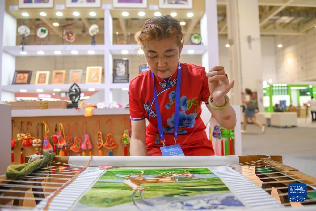6月27日,在第四屆全國殘疾人展能節上,來(lái)自青海的黃萬(wàn)梅現場(chǎng)展示皮繡技藝。