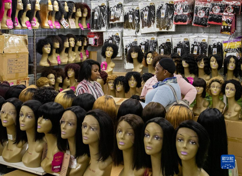 6月9日,在湖南邵陽(yáng)陽(yáng)光發(fā)品有限公司位于南非約翰內斯堡的店鋪內,顧客在試戴假發(fā)。