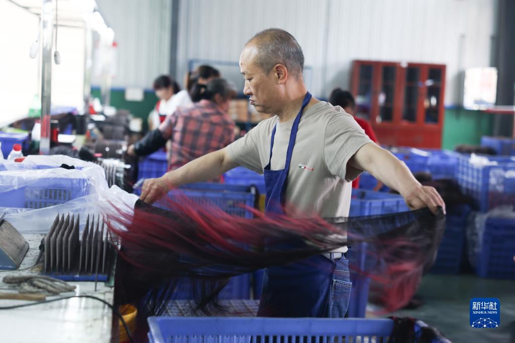5月25日,工人在湖南邵陽(yáng)美麗來(lái)發(fā)制品有限公司車(chē)間內生產(chǎn)假發(fā)。