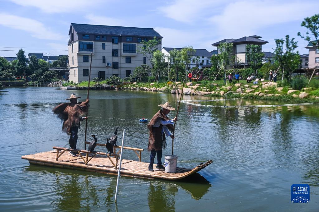 6月28日,在塘棲鎮丁河村共富工坊旁的河塘里,村民和游客們在觀(guān)看鸕鶿捕魚(yú)表演。