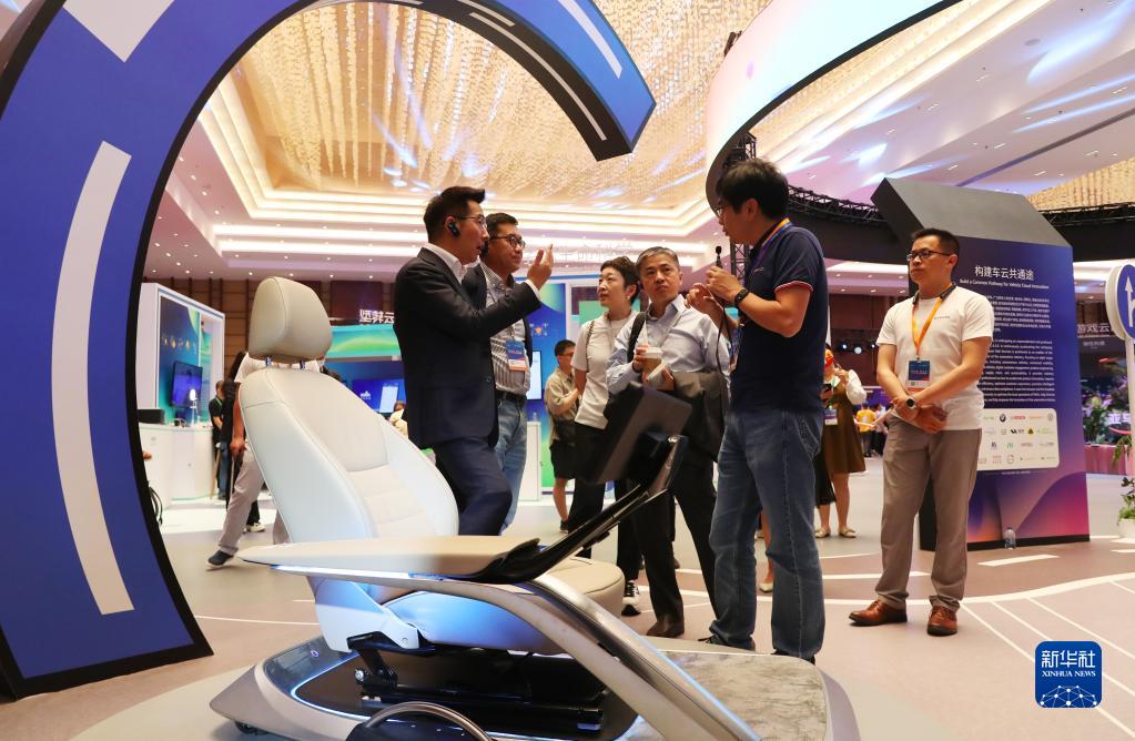 6月28日,參觀(guān)者在峰會(huì )展示區內的一個(gè)智能駕駛座艙展位前交流討論。