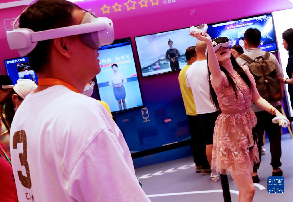 6月28日,參觀(guān)者在峰會(huì )展示區內體驗VR體感游戲。