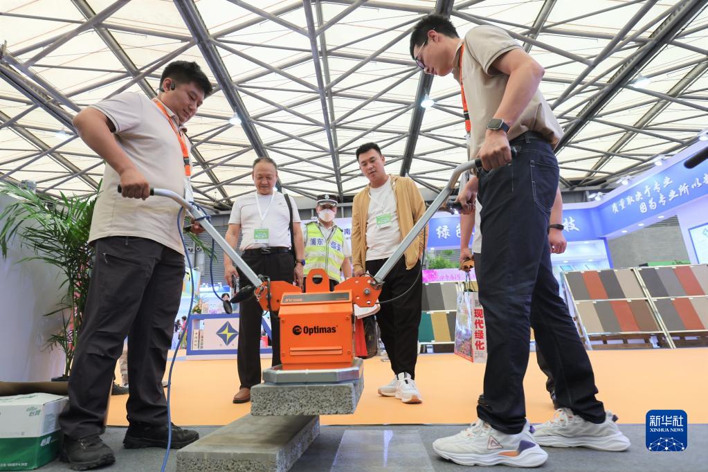 6月29日,參展商展示使用小型插電版真空裝置吸附磚材。