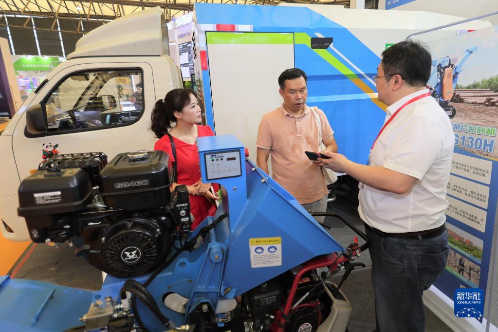 6月29日,參展商為參觀(guān)者介紹樹(shù)木削片粉碎設備。
