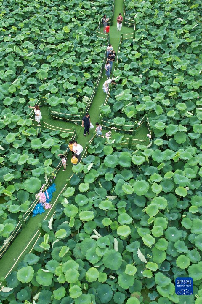 6月23日,在湖南省湘西土家族苗族自治州吉首市,游人在乾州古城胡家塘賞荷休閑(無(wú)人機照片)。