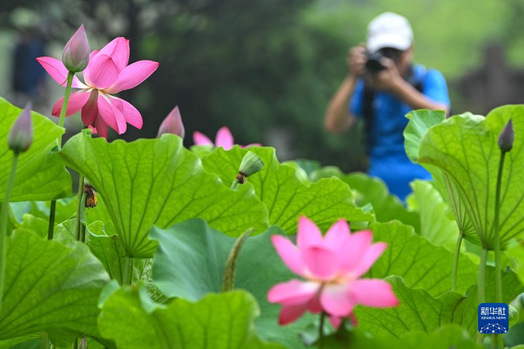 6月20日,游客在江蘇省昆山市亭林園拍攝荷花。