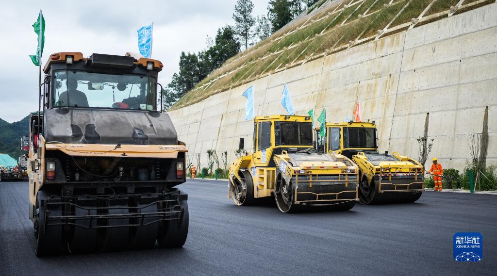 6月29日,中鐵十二局工人在貴金古高速公路清池至古藺段進(jìn)行路面施工。