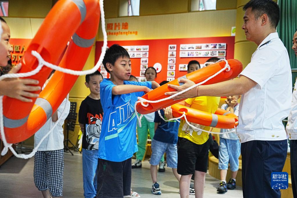 6月29日,在重慶市北碚區青少年活動(dòng)中心,北碚區交通局港航管理處工作人員在給孩子們講解救生圈使用方法。