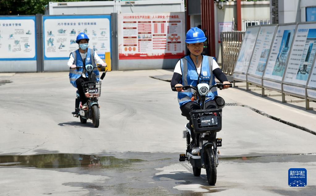 6月29日,張軍麗(前)和張坦騎電動(dòng)車(chē)前往工地。新華社記者 周科 攝