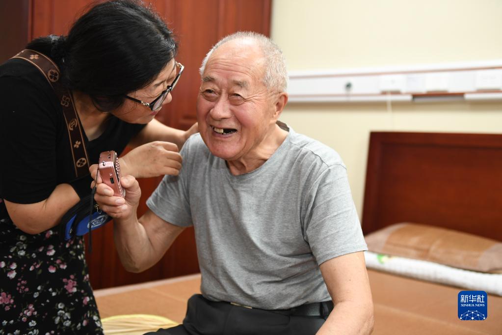 6月29日,在如東縣申丞護理院,工作人員在和老人聊天。
