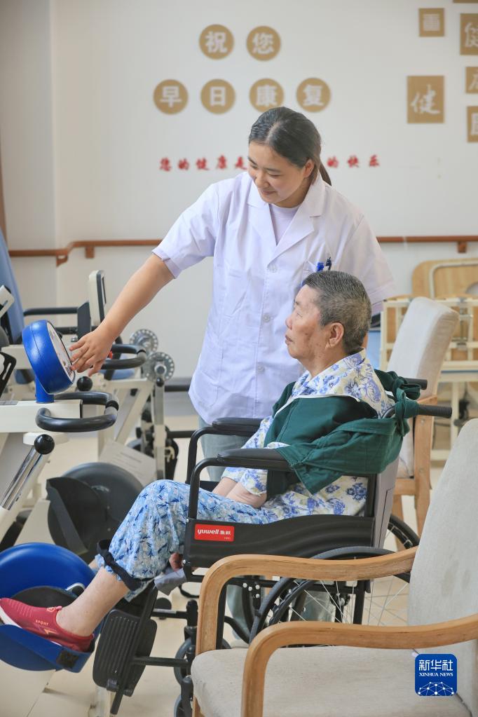6月27日,在如東縣申丞護理院,康復治療師在幫助老人進(jìn)行康復訓練。