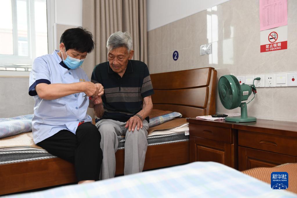 6月29日,護工在如東縣掘港敬老院為老人修剪指甲。